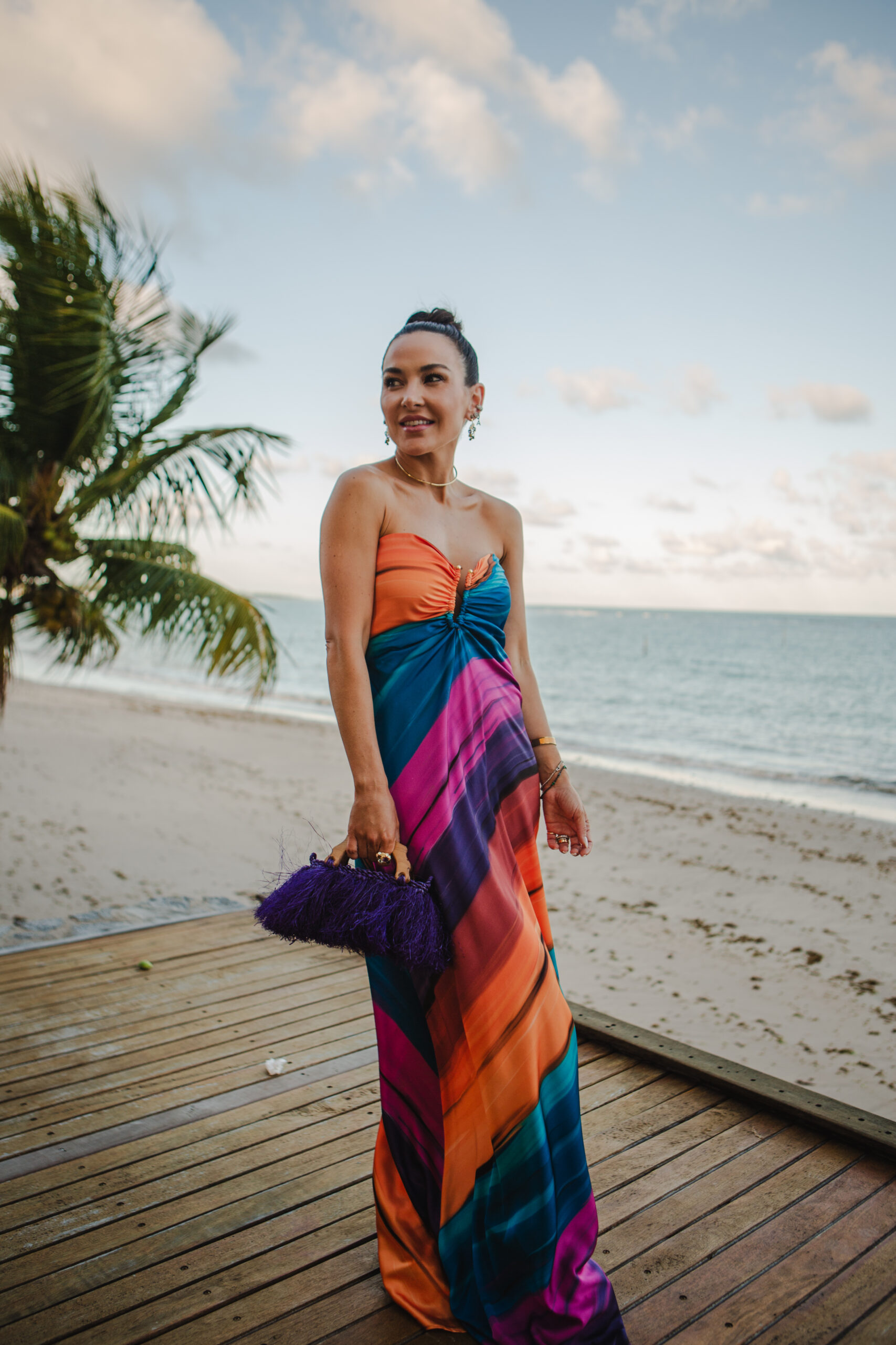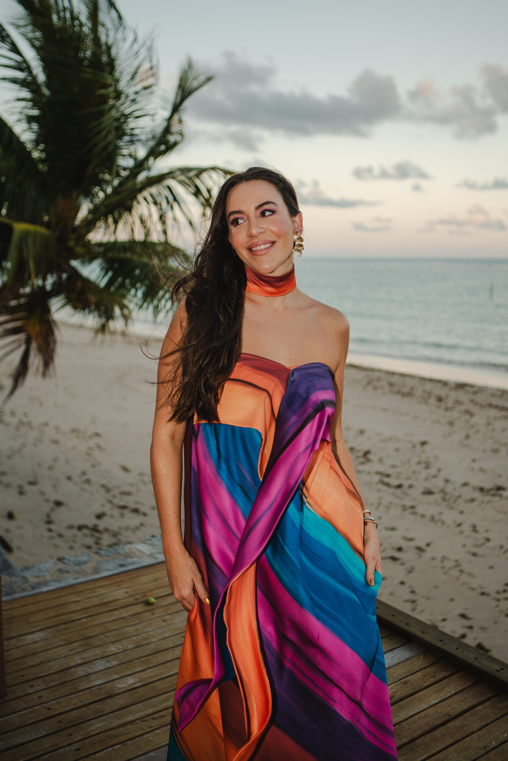 As estampas da Claire são inspiradas nos mais variados “céus de verão”, ou seja na alegria de estar em contato com a natureza. A expressividade artística da marca é revelada através de formas orgânicas, bem como degradê e tons pastel. O vestido Amália é um exemplo de cores vibrantes, apresentando um shape fluido e coordenado por uma saia longa.